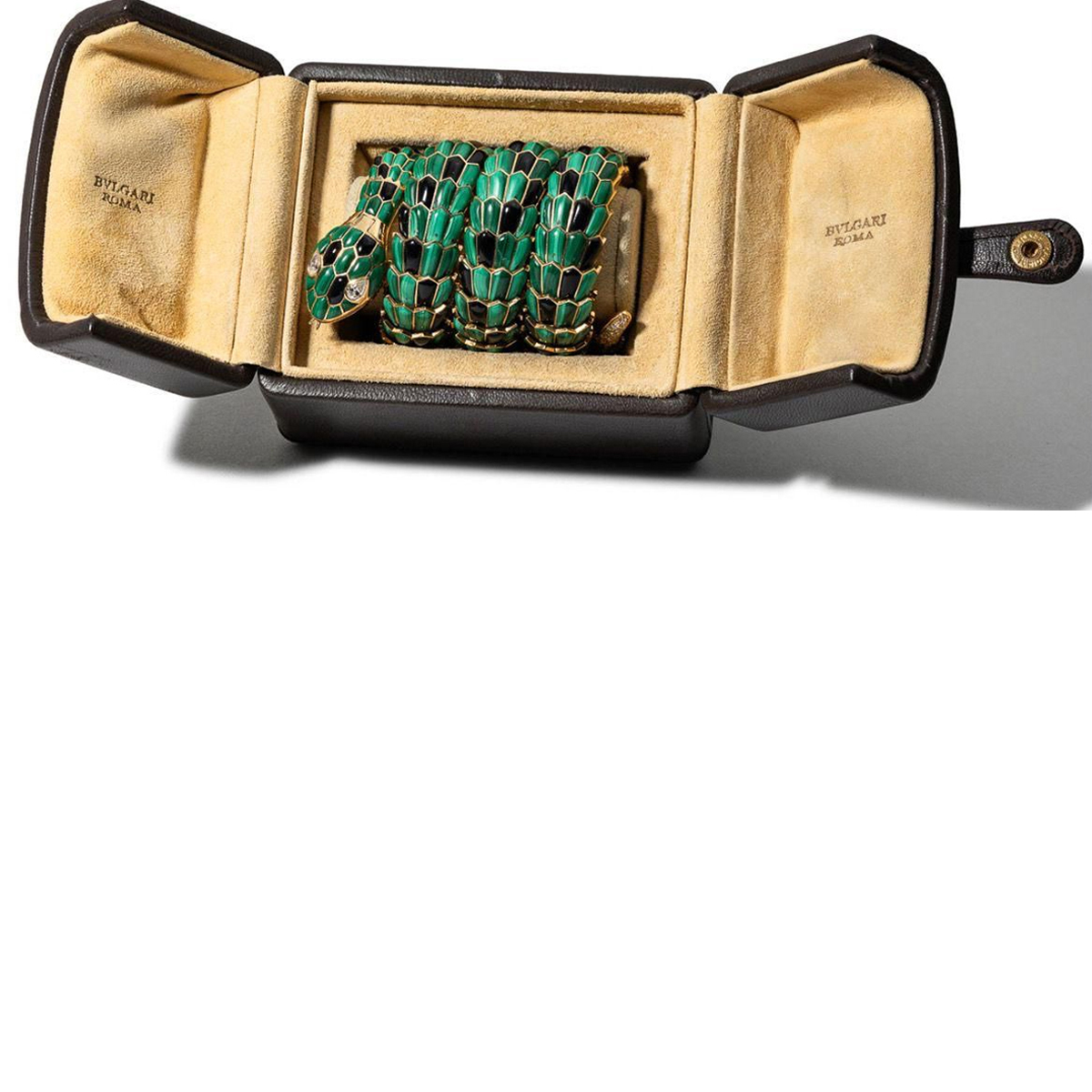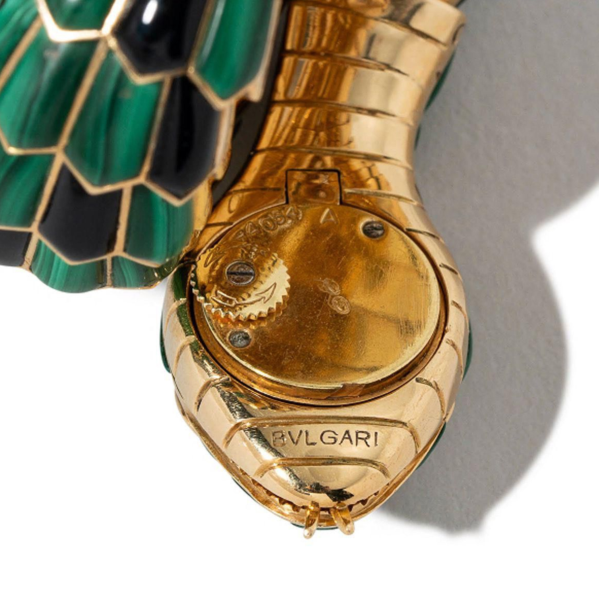 By the 1960s, the body of the Bulgari Serpenti bracelet-watches took on a more sophisticated design as well, featuring scales made from sheet gold that was attached to one another with gold pivots. Some of the designs feature gemstones such as malachite, lapis lazuli, coral, jade, onyx and turquoise were used to embellish the scales.