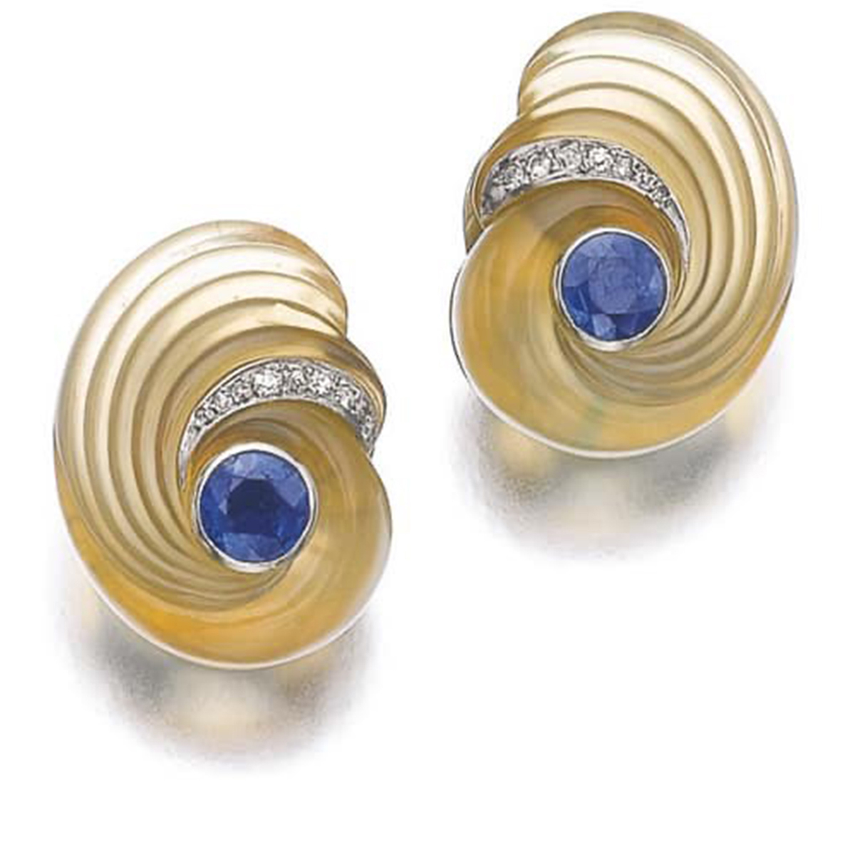 Large clip-on earrings were the style of the day and Belperron created interesting shapes and designs set with her signature carved gems. Spiral shells, leaves, fans and other textural shapes were her favorites, laying the foundations for the company’s style of the 1930s and 1940s.