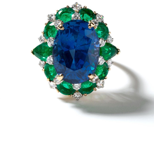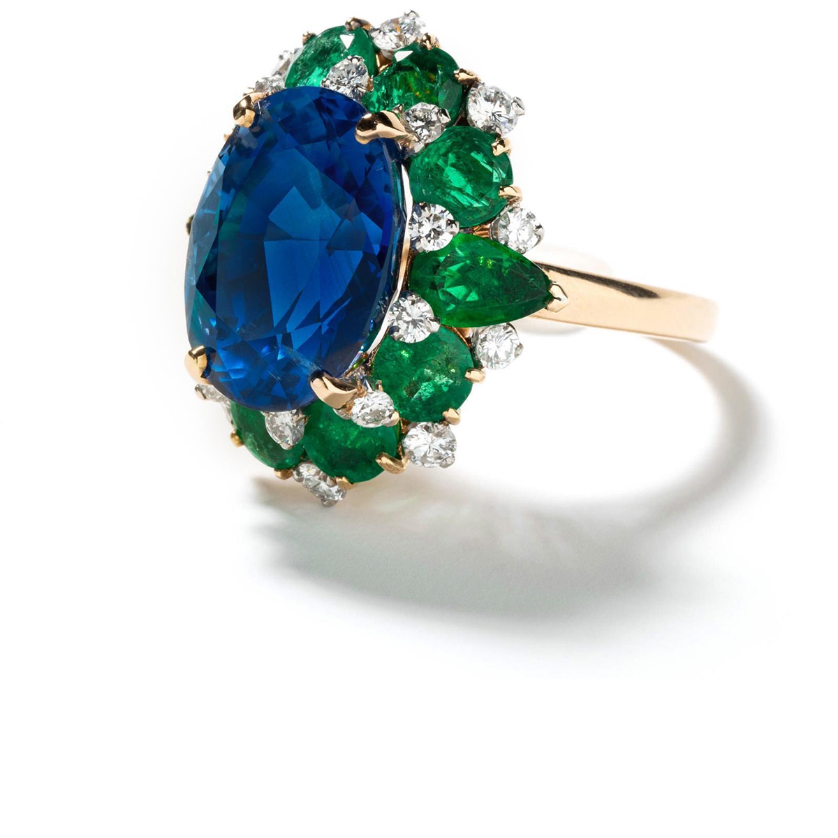 Featuring a blue sapphire, weighing 9.10 carats, diamonds weighing 0.40 carat and emeralds weighing 3 carats.