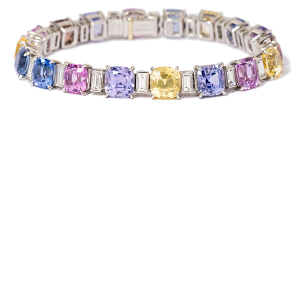 Featuring baguette cut diamonds weighing 3.50 carats and multi color cushion cut sapphires weighing 34.57 carats mounted in platinum.