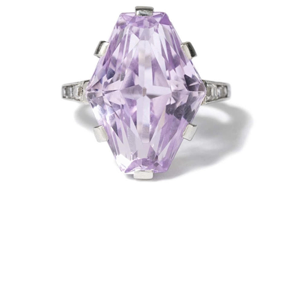 A triumph of geometry, light, and early 20th-century elegance, this exceptional Tiffany & Co. Art Deco ring features a mesmerizing kunzite in a bold, custom faceted lozenge silhouette. The pale violet-pink stone, set in platinum, is flanked by carre-cut diamonds along the shoulders, amplifying its linear Art Deco refinement evocative of the uniquely geometric architectural shapes of the era.