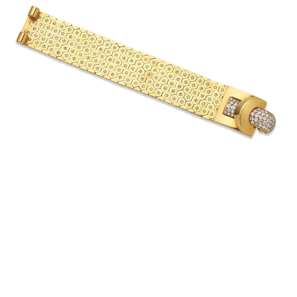 Of jarretière design, the articulated band of hexagonal links set with circular- and single-cut diamonds, decorated with a clasp of bombé design pavé-set with circular-cut diamonds.