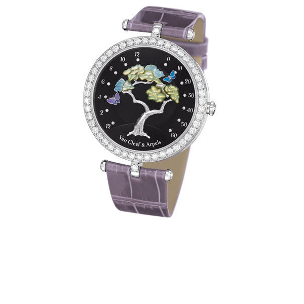 Two precious butterflies indicate the time, split retrograde movement; one butterfly indicates the passing minutes while the other keeps pace of the hours. Onyx, mother of pearl and diamonds mounted in 18K white gold.