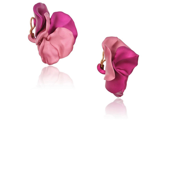 Designed as sculpted Pansy flowerheads and petals with a pink & fuchsia finish mounted in 18K rose gold. These floral earclips are part of a larger series of ultra-light weight floral motif earclips.