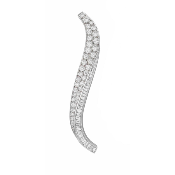 Van Cleef & Arpels brooch designed as a curved plaque, set with circular and baguette-cut diamonds, mounted in platinum; signed & numbered.