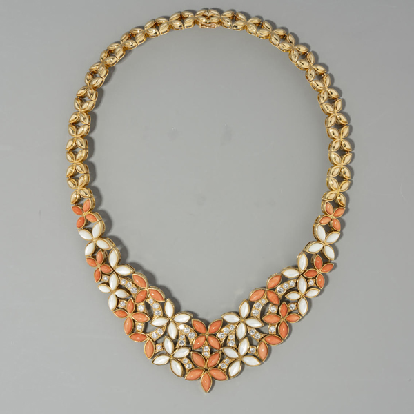 PEACH CORAL, MOTHER OF PEARL AND GOLD NECKLACE BY VAN CLEEF & ARPELS