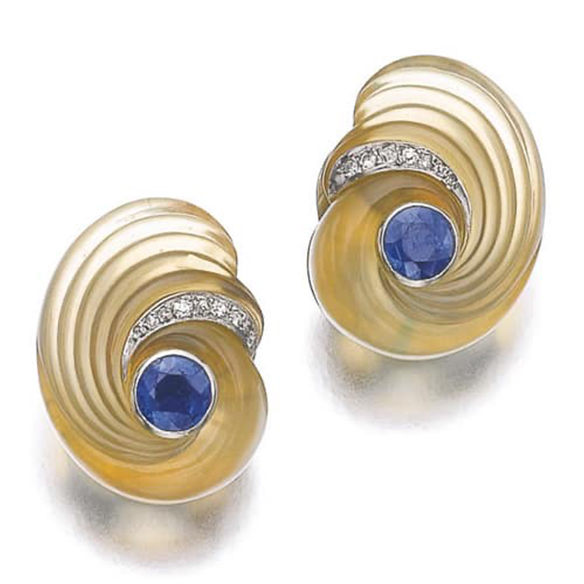 A PAIR OF CHALCEDONY SAPPHIRE AND DIAMOND EARRINGS BY SUZANNE BELPERRON, CIRCA 1942