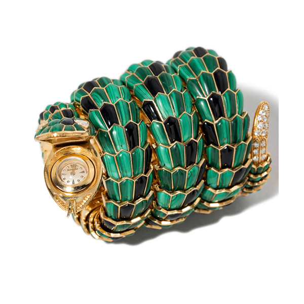 By the 1960s, the body of the Bulgari Serpenti bracelet-watches took on a more sophisticated design as well, featuring scales made from sheet gold that was attached to one another with gold pivots. Some of the designs feature gemstones such as malachite, lapis lazuli, coral, jade, onyx and turquoise were used to embellish the scales.