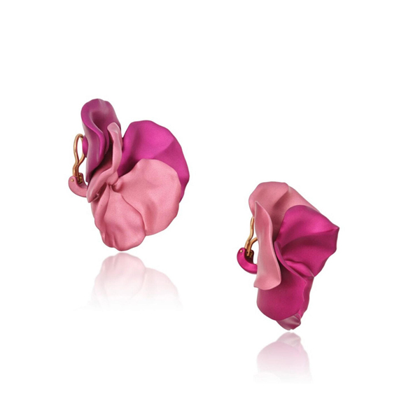 Designed as sculpted Pansy flowerheads and petals with a pink & fuchsia finish mounted in 18K rose gold. These floral earclips are part of a larger series of ultra-light weight floral motif earclips.