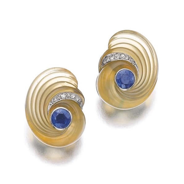 A PAIR OF CHALCEDONY SAPPHIRE AND DIAMOND EARRINGS BY SUZANNE BELPERRON, CIRCA 1942