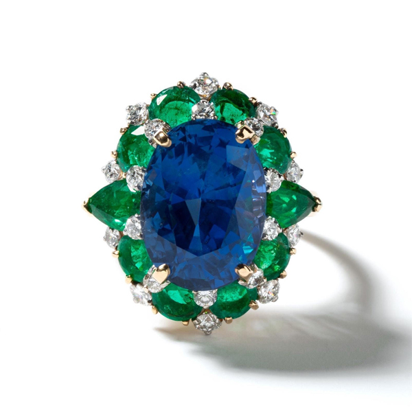UNHEATED CEYLON SAPPHIRE, EMERALD AND DIAMOND RING BY BVLGARI, CIRCA 1960s